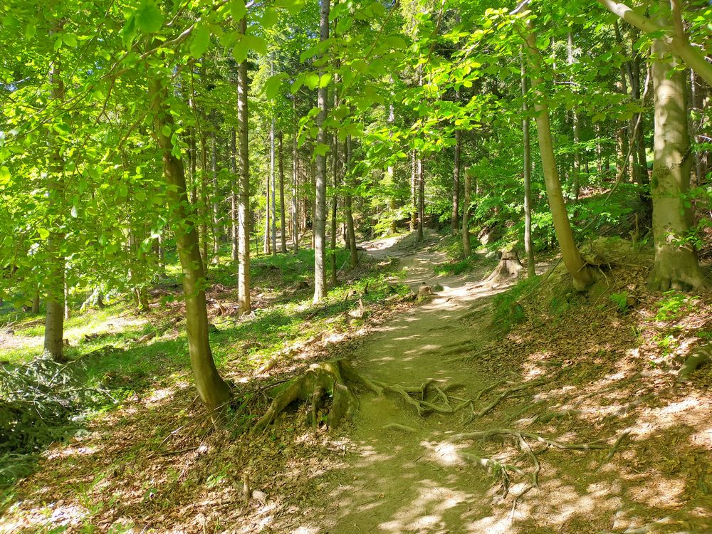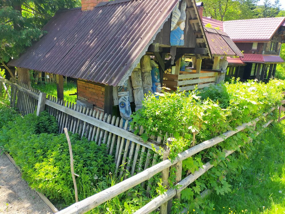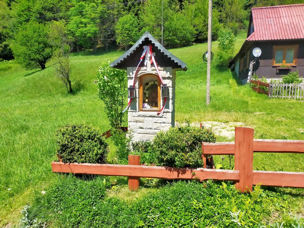 Sobota rano pozbierałem się trochę późnej, niż zamierzałem, jednak wszystko finalnie wyszło tak, jak sobie zaplanowałem. Wyjazd po 7 rano, po drodze tankowanie i do Żabnicy trafiłem przed 8. Nie było miejsca do zaparkowania bezpośrednio przy starcie czarnego szlaku na Halę Boraczą (około 860 m n.p.m.), więc znalazłem miejsce nieco wyżej, gdzie biegnie zielony szlak na Rysiankę (1322 m n.p.m.), którym zamierzałem wracać. O godzinie 8 wyruszyłem zatem w kierunku czarnego szlaku i dalej aż do schroniska PTTK na Hali Boraczej. Na początku czarnego szlaku biegnie asfaltowa droga. Na samym początku po prawej stronie mieści się Agroturystyka Skałka, obok niego drewniana kapliczka pw. Matki Bożej Nieustającej Pomocy. Po jakimś czasie droga asfaltowa biegnie zygzakiem w prawo, a szlak czary prowadzi do góry już górskim duktem.