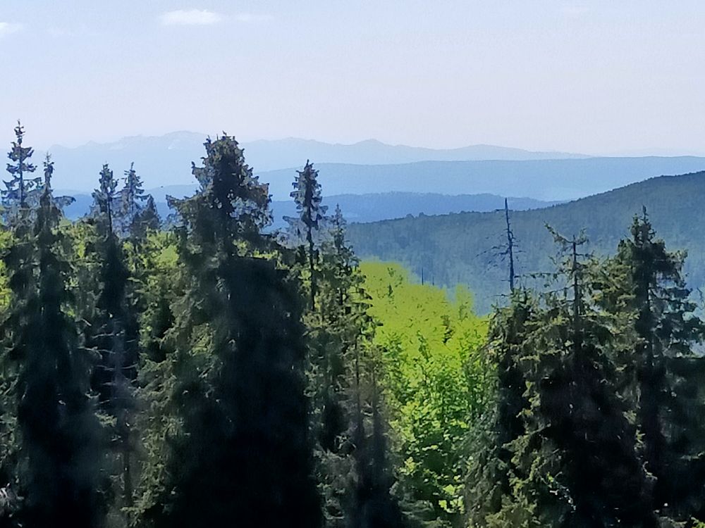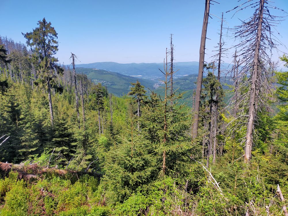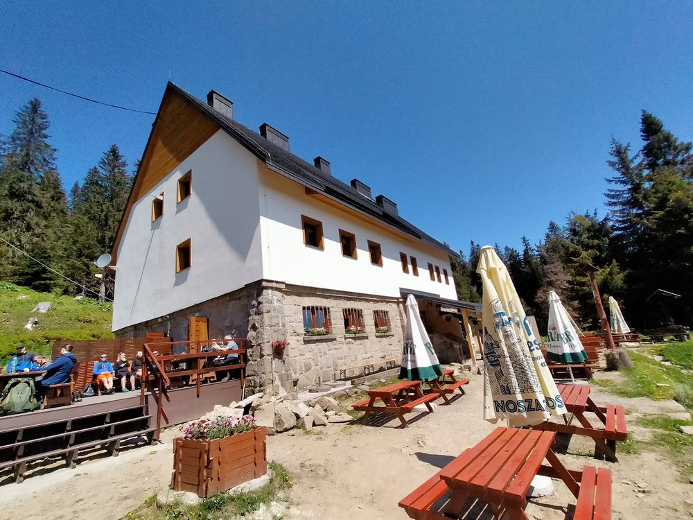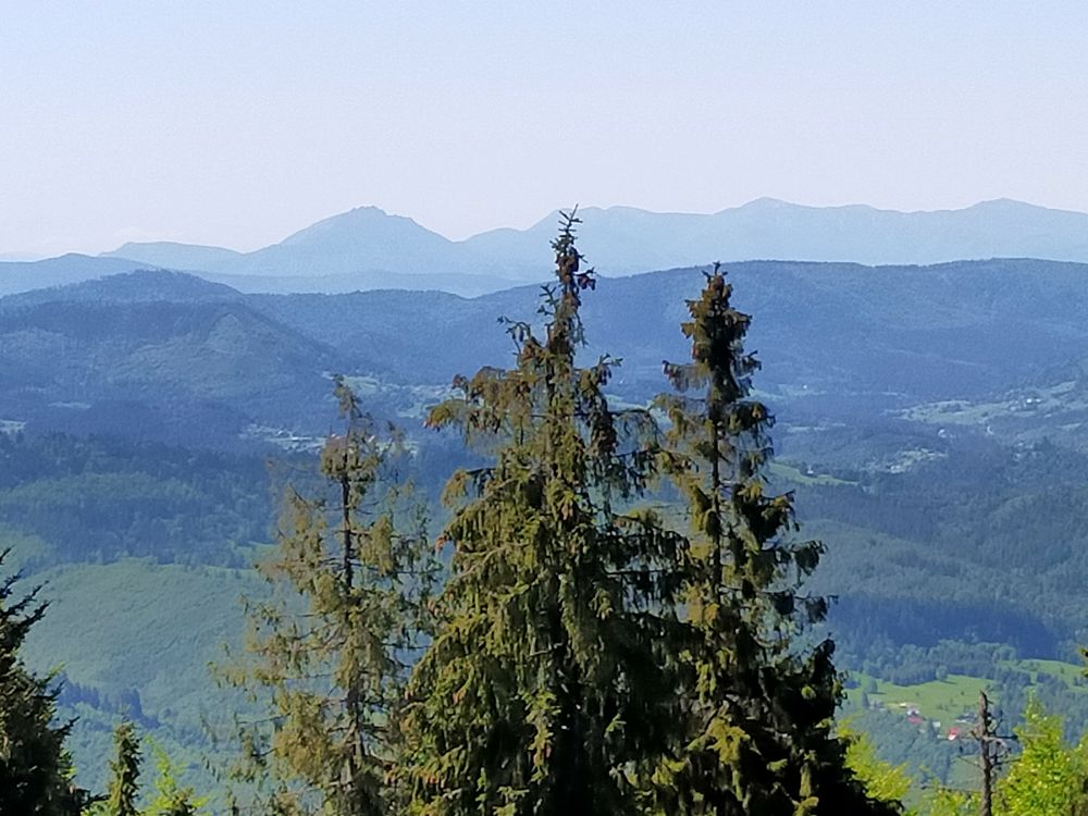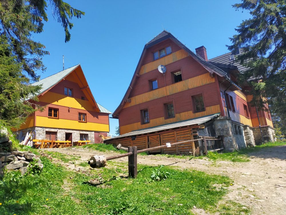 Po zjedzeniu bułki ruszyłem dalej tym razem żółtym szlakiem w kierunku Lipowskiej. Po drodze przechodzi poniżej szczytu Boraczego Wierchu (1248 m n.p.m.). Szlak biegnie miejscami stromo, po drodze towarzyszy przez długi czas wspaniały widok w kierunku południowym. Tatry, Fatra i inne pasma cudnie prezentują się na tle hal. Tylko owiec brak. Krajobraz w tej części Beskidu Żywieckiego przypomina trochę bieszczadzkie krajobrazy. Po jakiejś godzinie dotarłem do schroniska PTTK na Hali Lipowskiej. Miejsce bardzo klimatyczne. Ja jednak dość szybko ruszyłem dalej. Po 10 minutach trafiłem do kolejnego schroniska, tym razem było to schronisko PTTK na Hali Rysiance. Tutaj panorama jest najbardziej okazała, więc nie dziwi bardzo spora liczba turystów.
