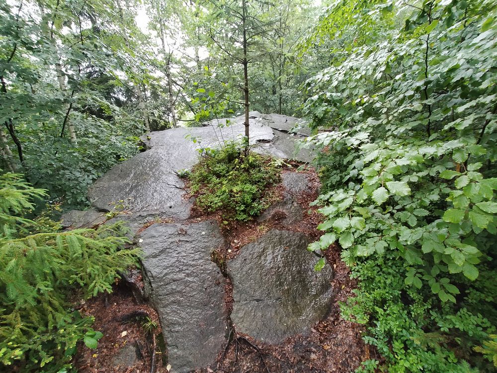 Dzisiejszy spacer odbyłem w deszczowej aurze. Wystartowałem z Wilkowic Górnych, można powiedzieć prawie z przysiółku Huciska. Udałem się w kierunku Skały Czarownic. Obecnie znajduje się ona przy czarnym szlaku prowadzącym na Magurkę Wilkowicką. W trakcie spaceru zaczął padać deszcz i schowałem się pod liściastym młodnikiem. Stałem tam, by mniej zmoknąć, jednak wiele to nie dało. Wyszedłem zatem z tego miejsca w kierunku widocznych ławek ze stołem.