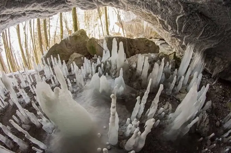 Zimą nad wejściem tworzą się efektowne nacieki lodowe, które dodatkowo zwiększają atrakcyjność tego miejsca.
