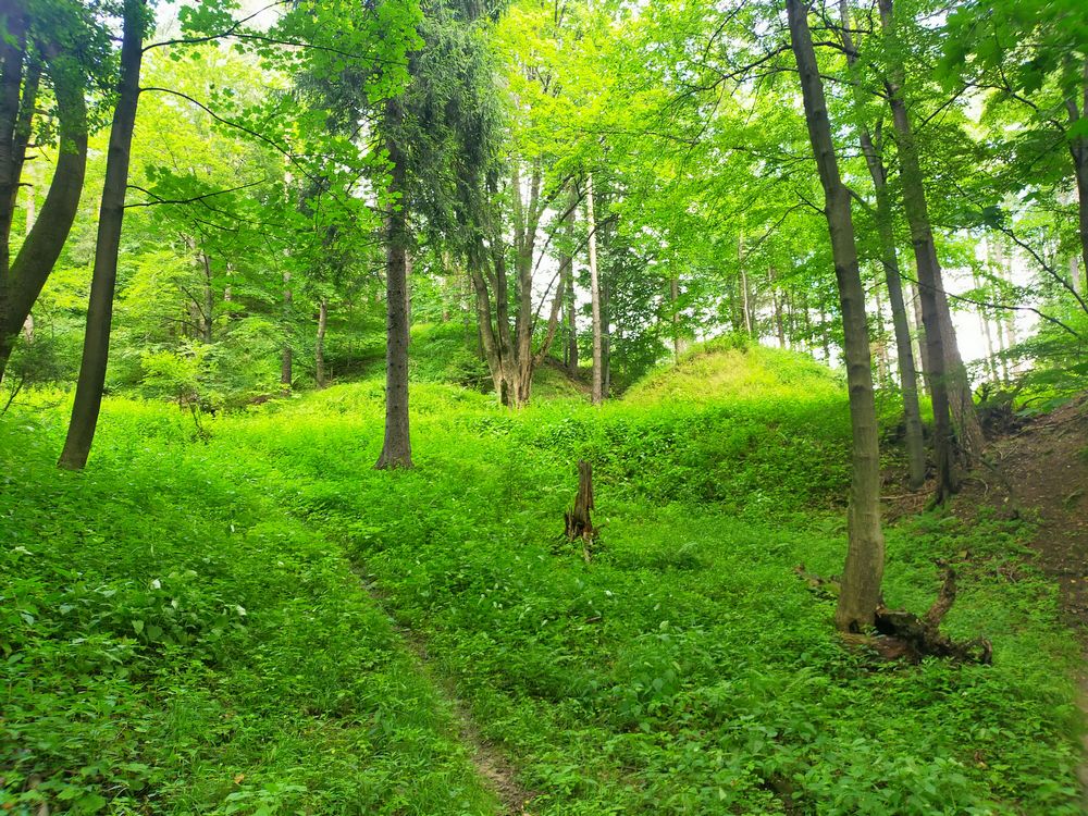 Głęboki wąwóz w gęstym, zielonym lesie, porośnięty bujną roślinnością i trawą. Po lewej stronie widoczny jest pień drzewa pokryty mchem, a w tle wysokie drzewa tworzą zieloną ścianę.