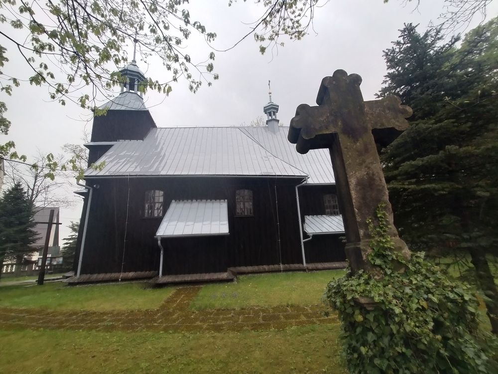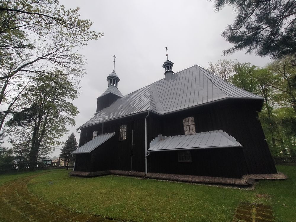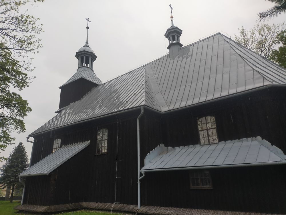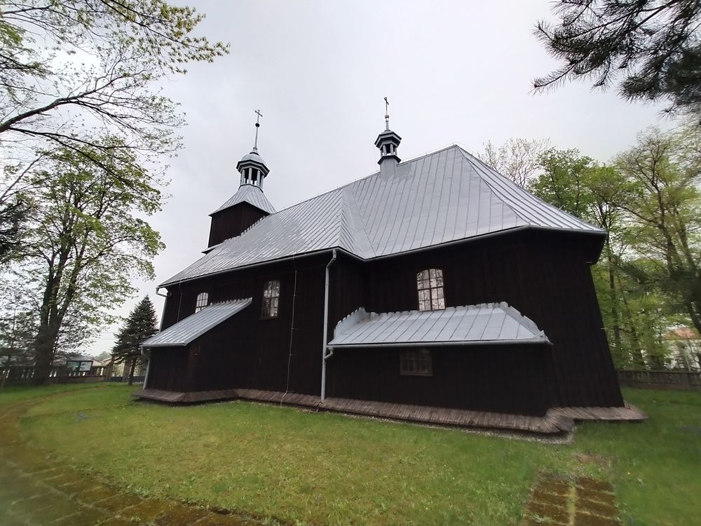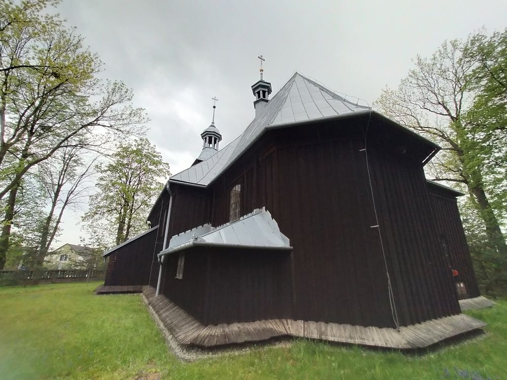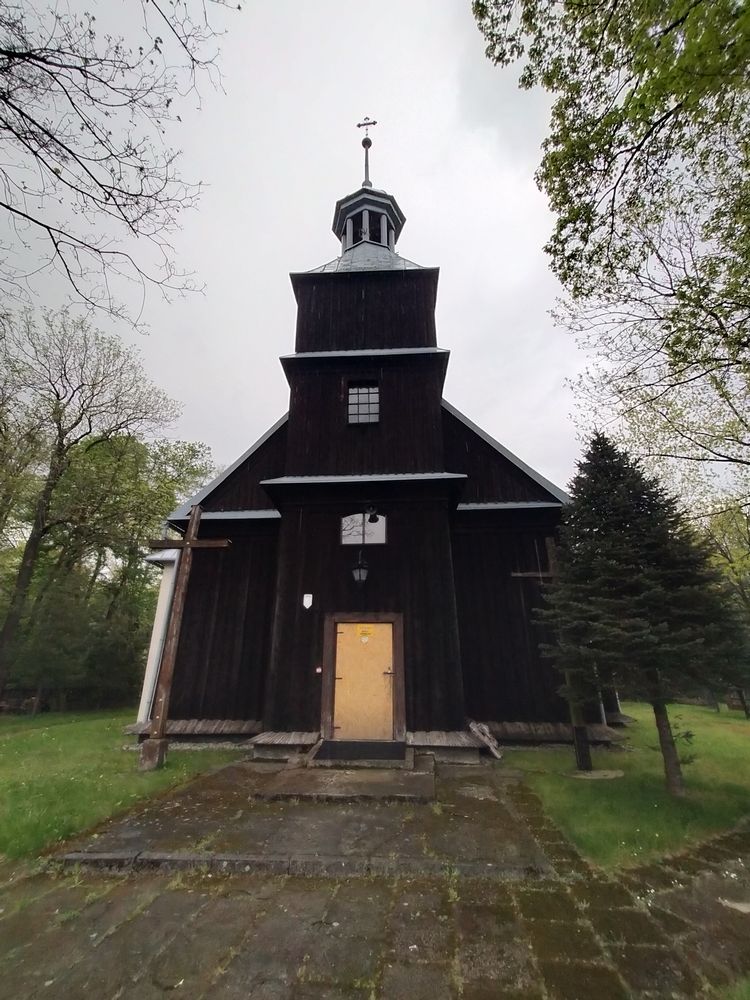 Obiekt jednonawowy jest orientowany konstrukcji zrębowej. Wieża pokryta blach z kolei jest konstrukcji słupowo-ramowej i zwieńczona pozorną latarnią. Prezbiterium znajduje się na wschodzie kościoła, a do niego i nawy od północnej strony przylega zakrystia. Pokrywa je jednokalenicowy eternitowy dach o formie pośredniej między typem śląskim a małopolskim. Otacza go kamienny mur, okalający pozostałość po cmentarzu parafialnym, ze starym zabytkowym krzyżem.