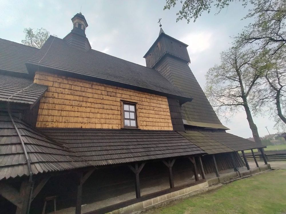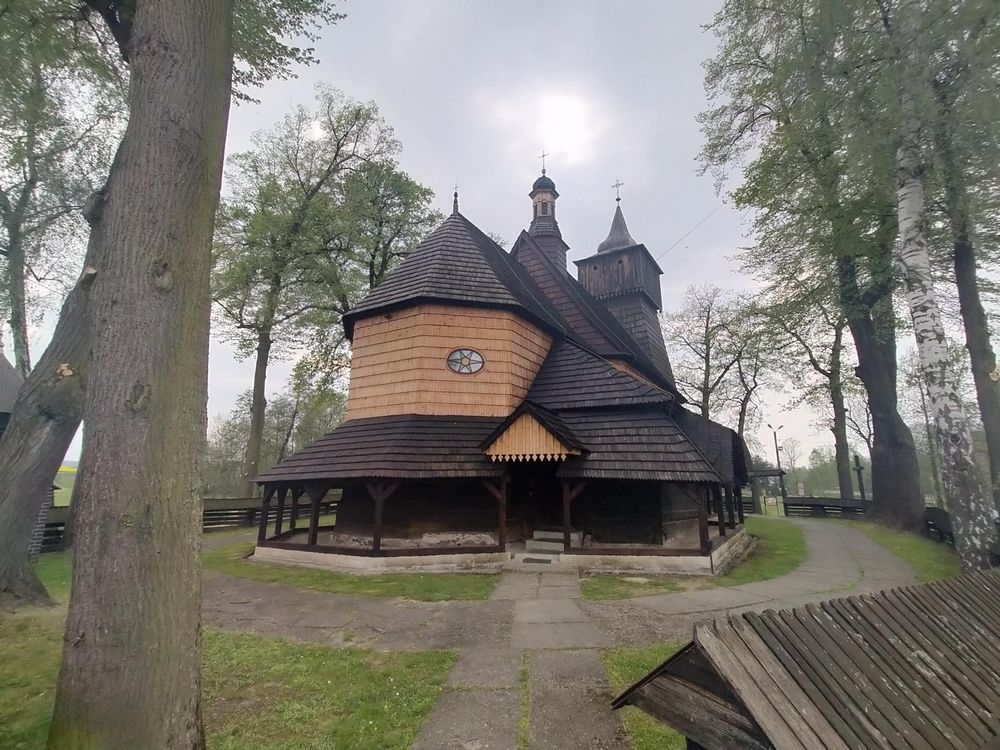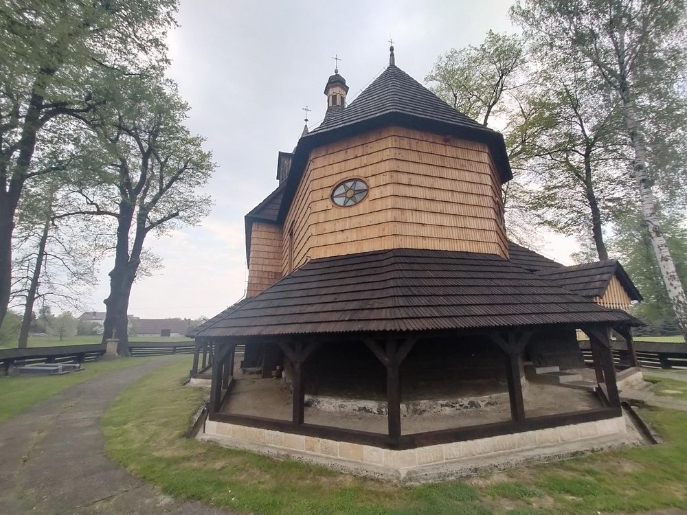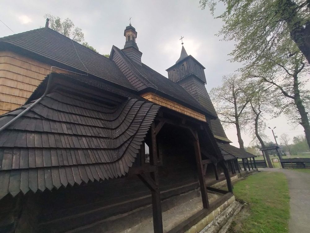 Kościół z trzech stron otaczają soboty, które wsparto na słupach i pokryto jednospadowym daszkiem. W pniu uschniętego dębu stworzono oryginalną kapliczkę. Zabytek znajduje się na szlaku architektury drewnianej.