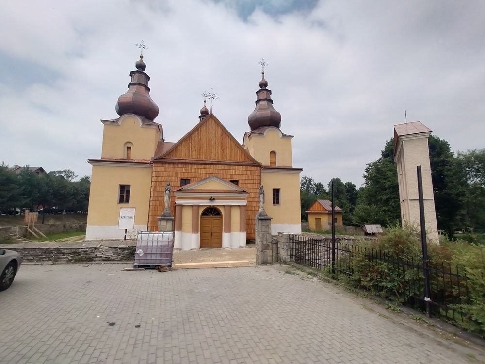Na część drewnianą kościoła składa się nawa oraz zamknięte trójbocznie prezbiterium. Nawę pokrywa dwuspadowy dach, a prezbiterium jest wielopołaciowe (w nim przedstawienie symboli siedmiu sakramentów). Wieżyczka na sygnaturkę wznosi się na kalenicy nawy, do której przylegają dwie kwadratowe kaplice. Ponad nimi wyrastają wieże zwieńczone cebulastymi hełmami z latarniami. W 1956 roku dobudowano murowaną zakrystię oraz kruchtę, przekształconą z portyku. Polichromia została odbudowana przez Pawła Mitka. Na zewnątrz znajdują się trzy dzwony z 1949 roku. Kościół otacza murowane ogrodzenie z kamienia polnego.
