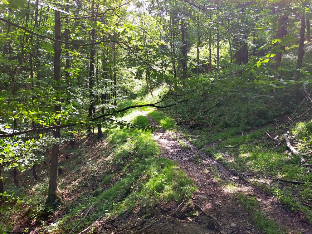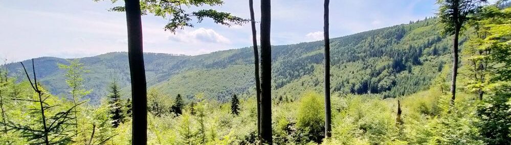 Około godziny 11 w upalne przedpołudnie podjechałem na Przełęcz Przegibek. Tam dość sporo zaparkowanych samochodów, ale udało mi się znaleźć miejsce. Poszedłem szlakiem czerwono-zielonym dla biegaczy narciarskich w kierunku Magurki. Dawno tędy nie szedłem, a trakty i ścieżki w okolicach przełęczy i Magurki Wilkowickiej także się pozmieniały. Powstały nowe drogi, a inne gdzieś znikły lub bardziej zarosły.