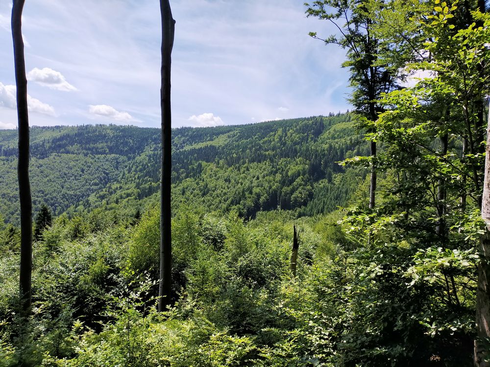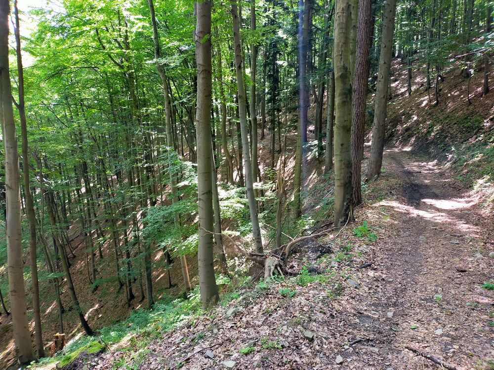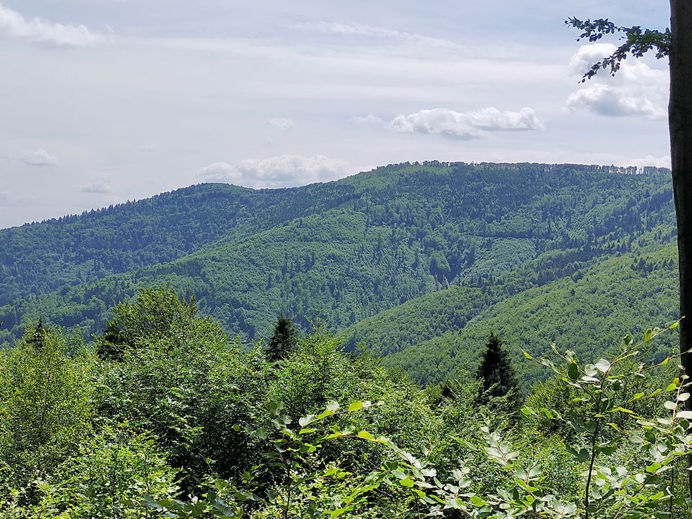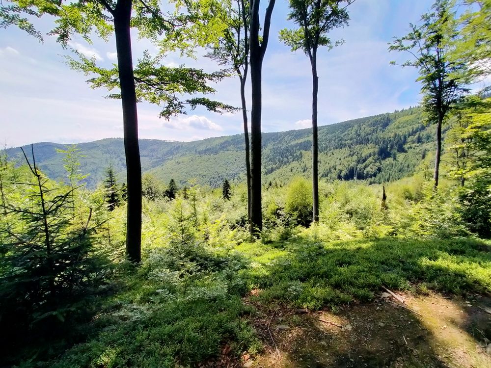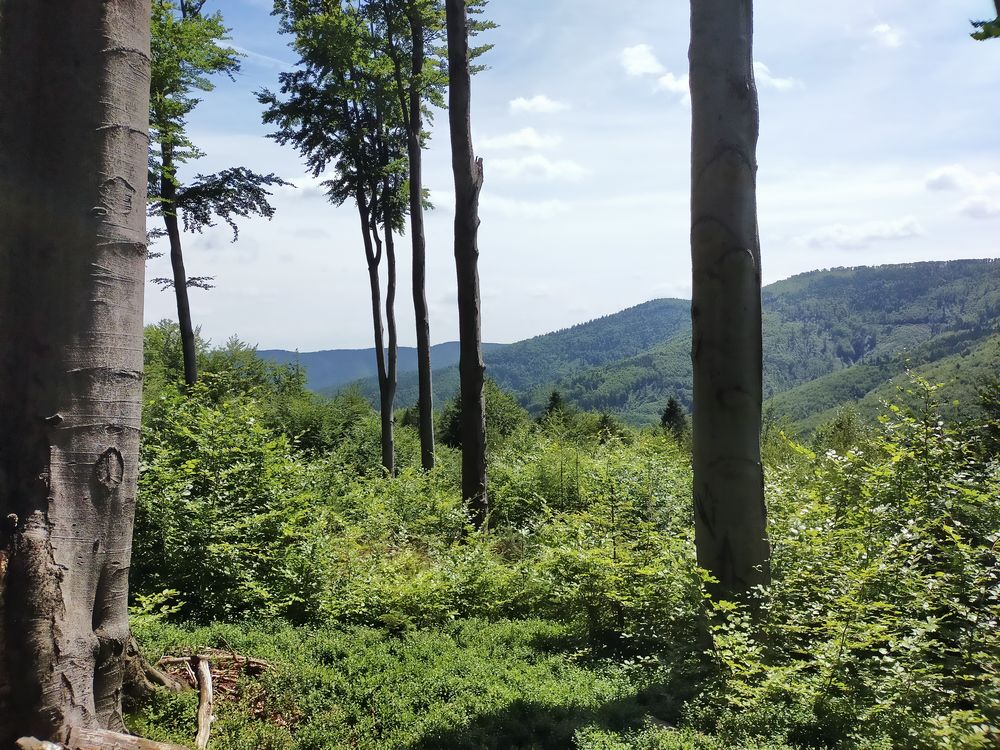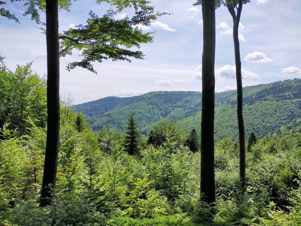 Trasa była ciekawa. Miejscami trochę kałuż i błota. W pewnym momencie szlak skręca w prawo, gdzie są drogowskazy, że na Przegibek jest stąd 1,8 kilometra, a na Magurkę 2,2 kilometra. Poszedłem dalej do góry, jednak wybrałem lewą ścieżkę, skąd po pewnym czasie rozpościera się zapierająca dech w piersiach panorama w kierunku Pasma Czupla i Magurki Wilkowickiej. Następnie cofnąłem się i właściwym szlakiem wyszedłem do łącznika ze szlakami żółtym i niebieskim.
