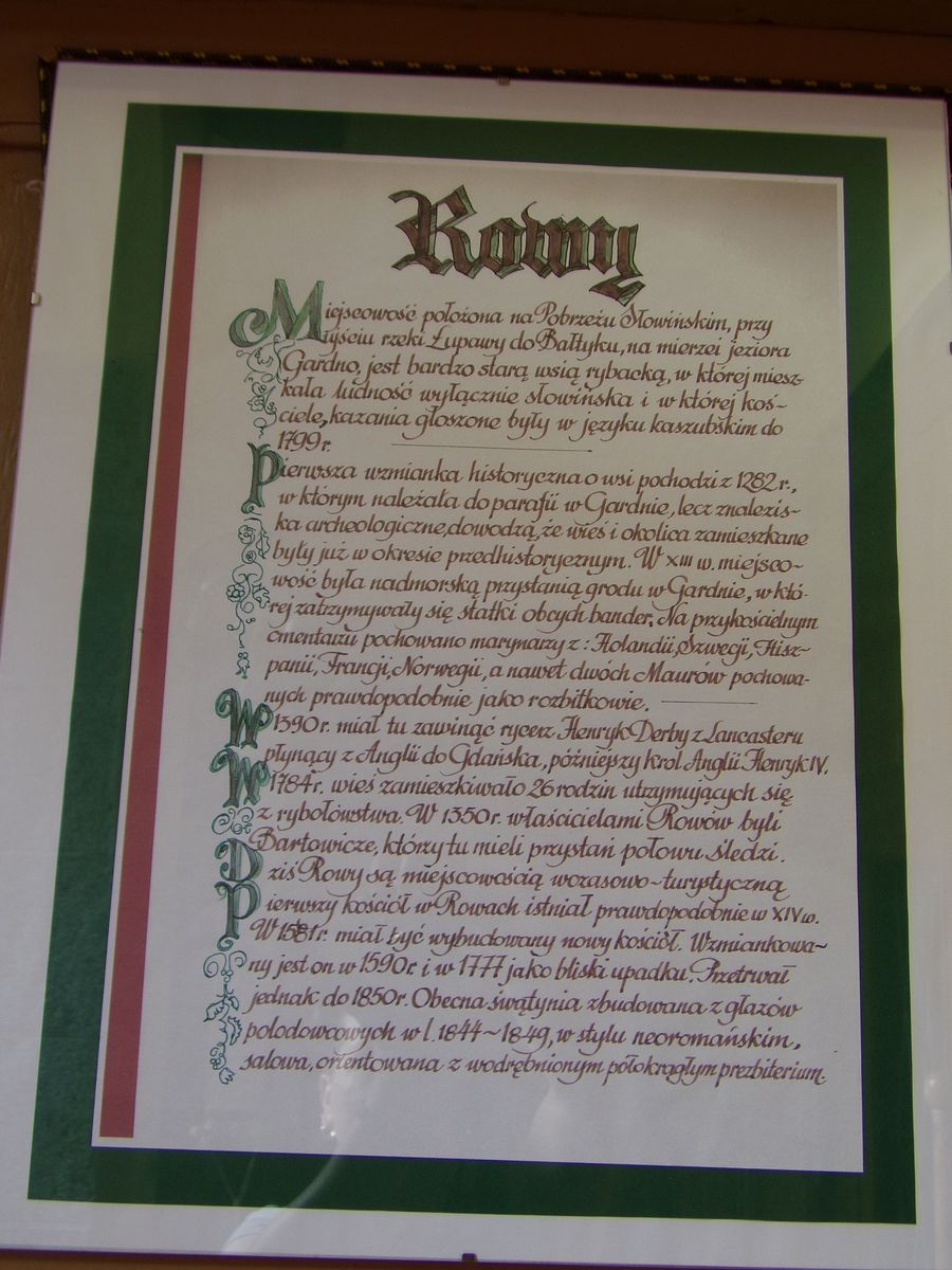 W bocznej ścianie tego neoromańskiego kościoła znajduje się tzw. Diabelski Kamień, który miał zwiastować marynarzom pogodę. Pierwsza świątynia, zapewne drewniana stanęła tu w XIV wieku. Warto wspomnieć, że jeszcze w 1799 odprawiano tu msze w języku słowińskim. Blisko kościoła znajduje się ścieżka prowadząca na Wzgórze Cmentarne. To samo wzniesienie było wcześniej gródkiem rycerskim i wciąż widać na jego terenie pozostałości fosy. Na owym wzgórzu chowano m.in cudzoziemców, którzy ginęli na morzu od końca XVIII wieku. W Rowach zaczyna się także terytorium Słowińskiego Parku Narodowego, a szlak prowadzi przez Jezioro Gardno, Czołpino (z ciekawą latarnią morską), aż po Łebę.