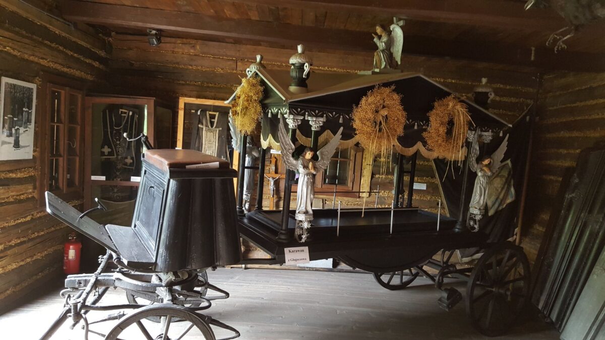 Ta część skansenu pokazuje, jak ważne miejsce w tradycyjnej kulturze wsi zajmowały obrzędy związane z ostatnim pożegnaniem zmarłych.