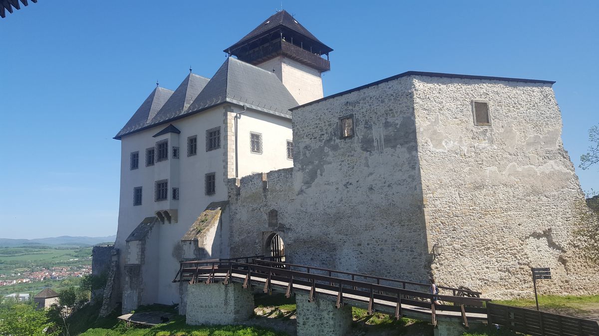 Niespiesznym krokiem mijamy kolejne bramy i docieramy do górnego dziedzińca. Część wystaw jest dla nas niedostępna (tańsza „opcja A” zwiedzania), więc kierujemy się do wieży widokowej. Stromymi kamiennymi schodkami docieramy na jej szczyt, skąd podziwiamy wspaniały widok. Jest naprawdę zachwycający; u naszych stóp wije się Wag, w oddali majaczą m.in. pasma karpackie, takie jak: Góry Inowieckie (słow. Považský Inovec), Góry Strażowskie (słow. Strážovské vrchy), Białe Karpaty (słow. Biele Karpaty, cz. Bílé Karpaty) i Małe Karpaty (słow. Malé Karpaty).