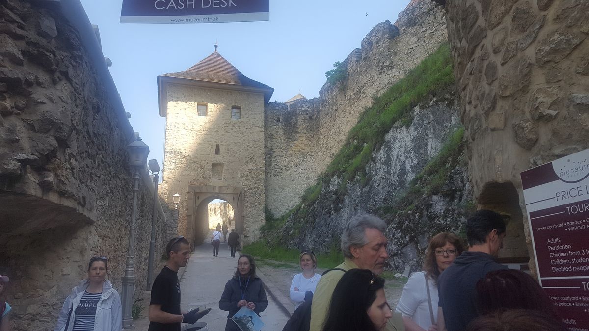 Spacerem przez Mierove Namiestie i potem ulicą Matusovą docieramy do bramy zamku i kasy. Do wyboru są dwie opcje zwiedzania: bez przewodnika za 5 euro od głowy, z przewodnikiem (o 1 euro więcej). Perspektywa zwiedzania zamku w towarzystwie dwóch głośnych szkolnych wycieczek sprawia, że decydujemy się na tańsze rozwiązanie. Później okazuje się, że to była bardzo dobra decyzja, bo i tak nie usłyszelibyśmy przewodnika 🙂 Kupujemy bilety i przekraczamy bramę trenczyńskiego zamku.