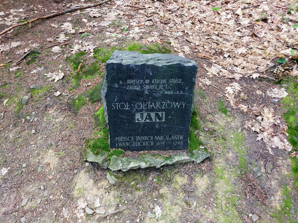 W Mikuszowicach Śląskich (dzielnica Bielska-Białej), dokładniej w Cygańskim Lesie powyżej bielskich Błoń znajduje się Stół ołtarzowy „Jan”. Można do niego dotrzeć czerwonym szlakiem biegnącym na Kozią Górę. Zaraz po minięciu dawnej bielskiej leśniczówki na Błoniach (obok znajduje się pomnik leśniczego Andrzeja Schuberta), po wejściu do lasu mieści się on wraz z tablicą po prawej stronie. Ustawiono go w 1817 roku, by upamiętnić 300-lecie reformacji w miejscu, gdzie w latach 1654-1709 odbywały się tajne nabożeństwa protestanckie. Kamienny ołtarz składa się z okrągłej płyty, która jest położona na trzech cylindrycznych głazach. Na boku ołtarza widnieje data 1817. Na kamieniu umieszczonym za stołem w 1996 roku widnieje inskrypcja: