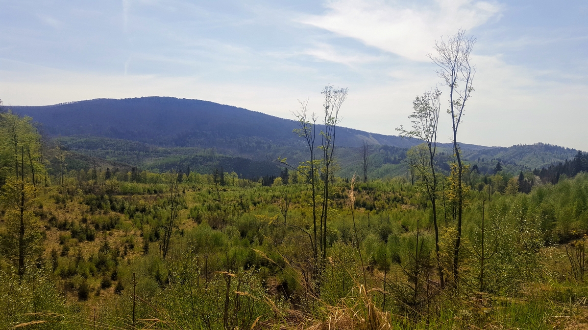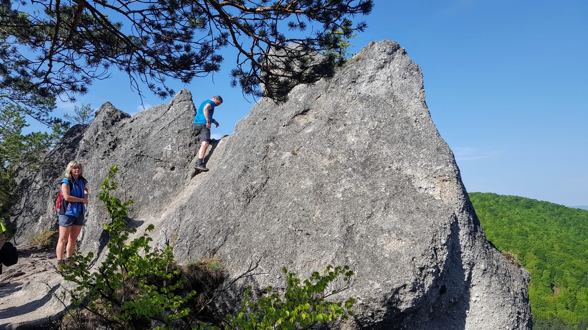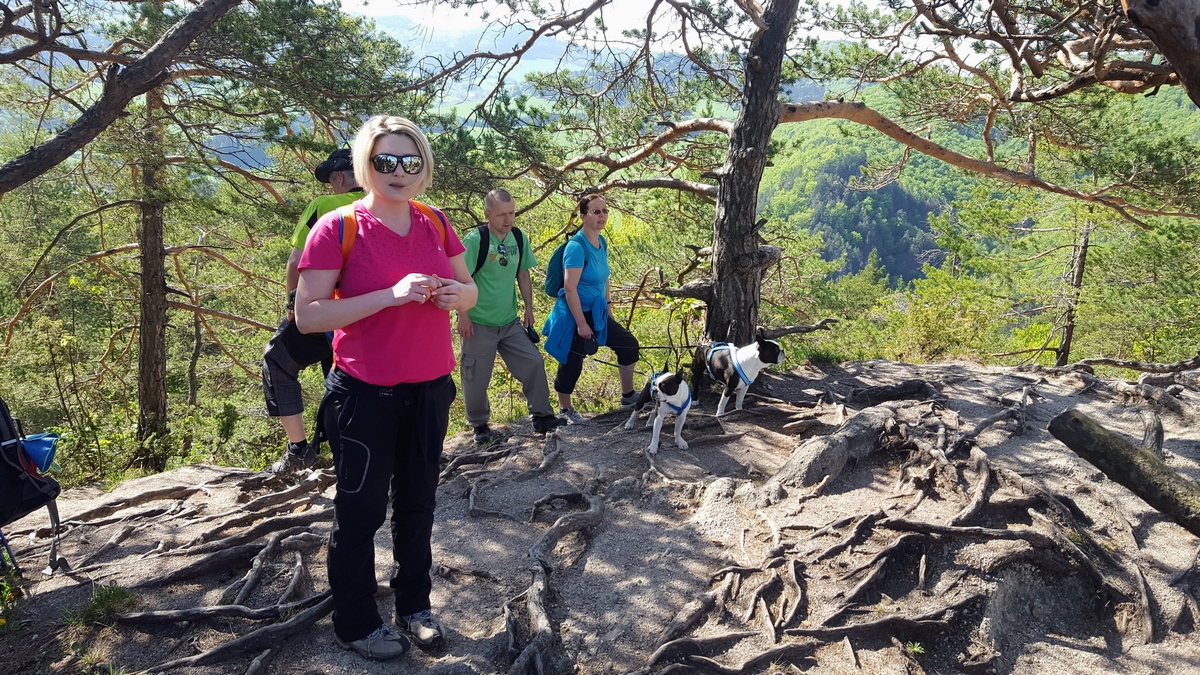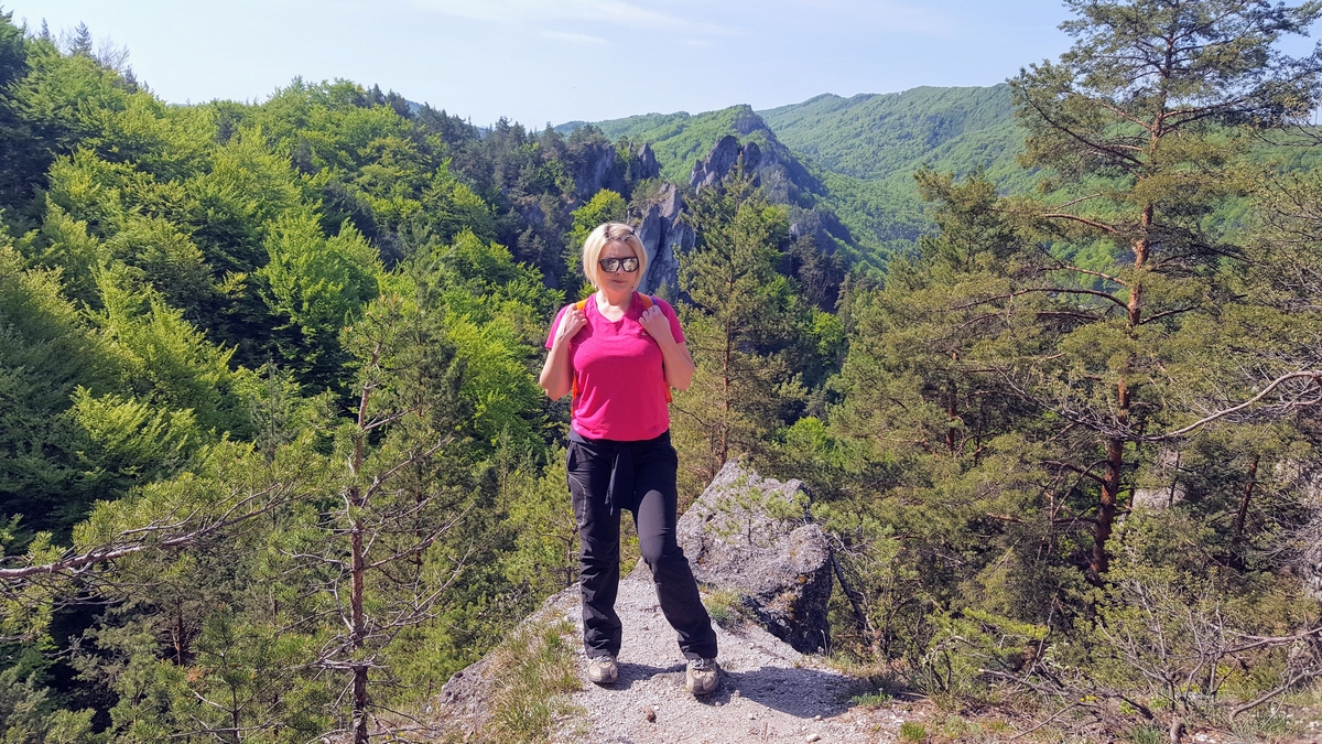 No cóż, komu w drogę… temu plecak na plecy. Wyruszamy zielonym szlakiem, planując pętlę według wskazówek z tablicy informacyjnej. Na początku podejście jest dość strome. Trzeba uważać na wystające zewsząd korzenie drzew, trochę się męczę, ale później szlak łagodnieje i prowadzi przyjemnie chłodnym wąwozem. Po niecałej godzinie docieramy do pierwszego z wielu punktów widokowych. Są skałki, na które wdrapują się co odważniejsi, żeby zdjęcie było bardziej „wypasione”. Nam wystarcza stanie i gapienie się na przepiękne krajobrazy okolicznych pasm karpackich. No dech zapiera, a nawet nie dotarliśmy na szczyt!