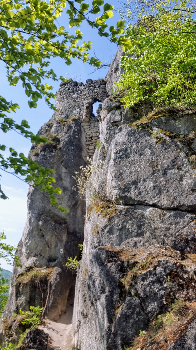 Po krótkiej chwili odpoczynku ruszamy dalej. Szlak jest urozmaicony (tu skałka, tam drabinka, gdzie indziej klamra) więc wędrówka jest czystą przyjemnością. Szybciej niż zakładałam, stajemy u podnóży ruin sulowskiego zamku (Súľovský hrad). Został wzniesiony w XV wieku, prawdopodobnie przez husytów i jest jednym z najtrudniej dostępnych obiektów Słowacji. W 1550 roku został strawiony przez pożar, a następnie odbudowany. XVII wiek to próby jego renowacji i unowocześniania (ostatnią próbę podjęła Katarína Bošániova w 1682 roku, jednak nie doszła ona do skutku). Do ostatecznego upadku zamku doprowadziło trzęsienie ziemi, które wystąpiło w 1858 roku.