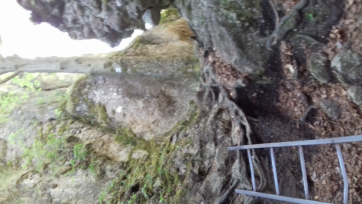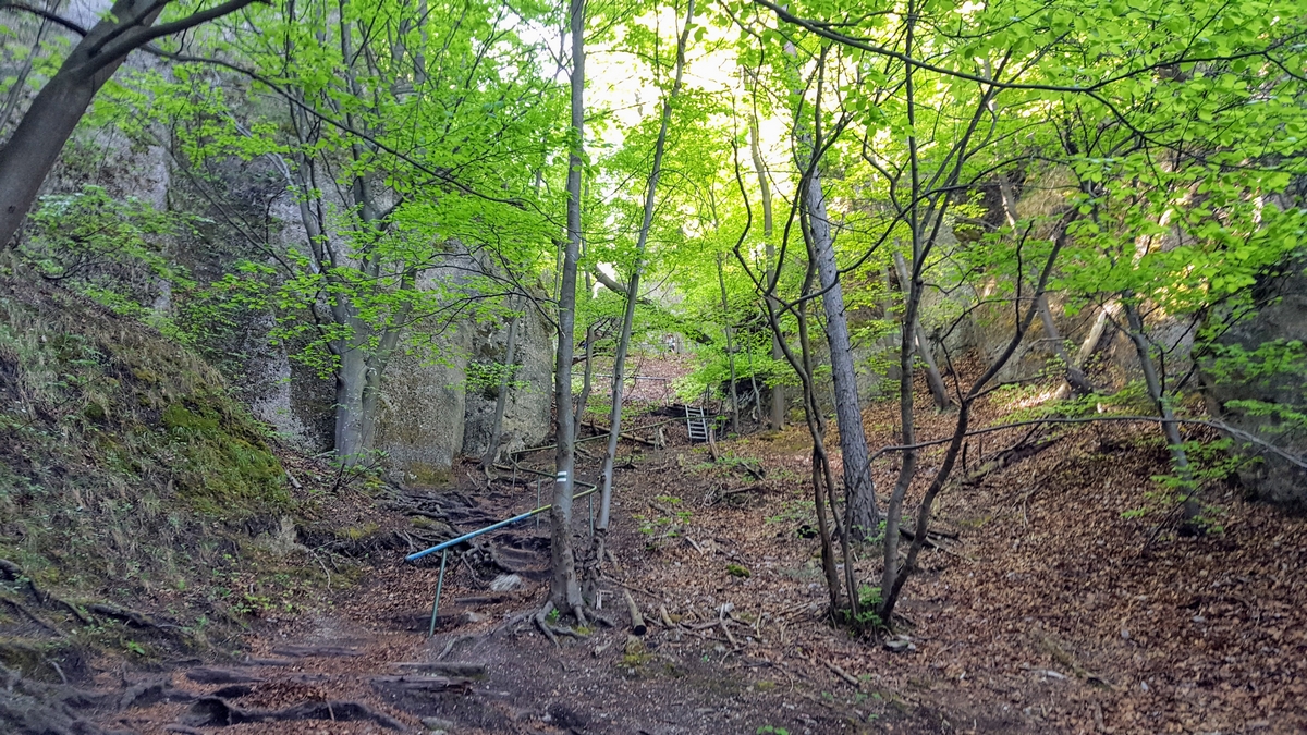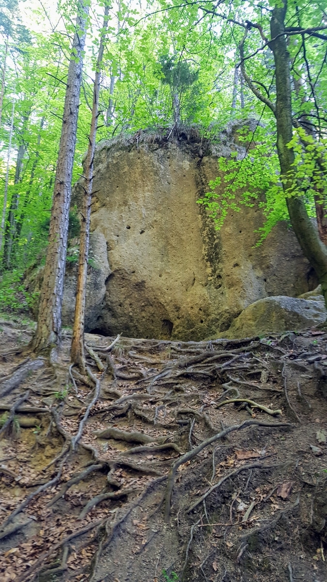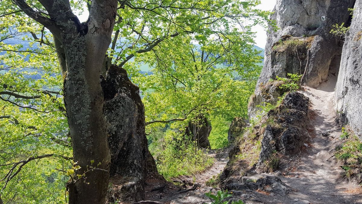 Ostrożnie wdrapujemy się na górny zamek i przez dłuższą chwilę napawamy się widokami. Turystów jednak przybywa, robi się tłoczno, więc ograniczamy przyjemności, wracamy na szlak i schodzimy w dół. Cieszę się, że jest sucho, bo zejście jest strome. Zalegające liście, korzenie drzew i wątpliwy stan niektórych poręczy zwalniają tempo, ale i tak zejście do parkingu (najpierw zielonym szlakiem, potem czerwonym) nie zajmuje wiele czasu. Cała wycieczka, wraz z postojami na zdjęcia i podziwianie widoków trwa około 3 godzin. Nie jest męcząca, a dzięki urozmaiconemu terenowi naprawdę przyjemna! W sam raz na początek wiosennego sezonu 😉