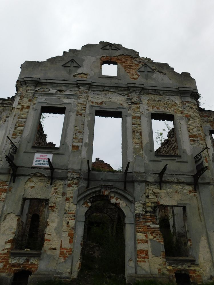 To był wypad totalnie spontaniczny, zero map, tylko Internet w telefonie od wszystkiego. Przejeżdżając między miejscowościami, zauważyliśmy niesamowite ruiny. To była miejscowość Włodowice, a przed nami stał dwór, pałac, zamek (jak kto woli). Z przodu, strona chyba reprezentacyjna trawa wykoszona, tablica informacyjna, cóż to za cudo tu stoi, za to na tyłach obraz nędzy i rozpaczy. Zarośnięte wysoką trawą, częściowo jakieś wysypisko. Na froncie tabliczka ostrzegawcza, że budynek grozi zawaleniem, więc ostrożnie tylko robiło się kilka kroków do środka, bacząc na rozpadające się piętro, które w większości dawno już spadło na parter. Wejście do piwnicy aż prosiło się na to, żeby tam zajrzeć, ale zostawiliśmy to na kolejny raz 😉 Mnóstwo puszek, butelek, papierów po lokalnych imprezach…