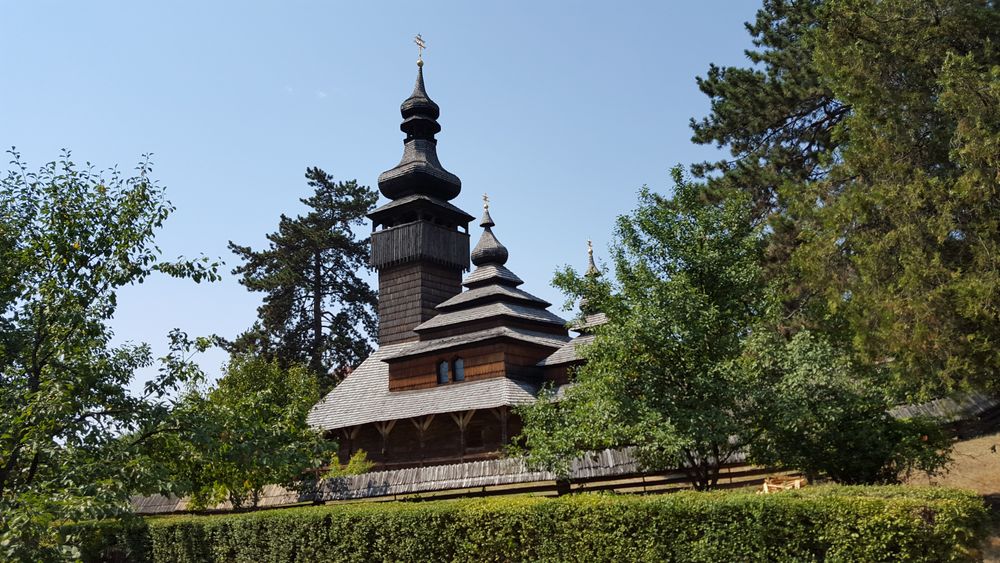 Naprzeciwko zamku znajduje się wspomniany skansen. Zakupiliśmy tutaj albumy i udaliśmy się na jego zwiedzanie. W skansenie mieści się około 30 obiektów budownictwa ukraińskiego, rumuńskiego i węgierskiego. Najważniejszym zabytkiem niewątpliwie jest cerkiew św. Mikołaja Archanioła z Szełestowa z XVIII wieku. Po zwiedzeniu muzeum udaliśmy się w stronę centrum, gdzie mieliśmy zaparkowany samochód. Upał był niesamowity i nie zapominał o sobie. Nie starczyło nam już, można powiedzieć siły, by zwiedzić inne zabytki miasta: rotunda Horiańska pod wezwaniem św. Anny, synagoga i inne kościoły. Niemniej jednak zadowoleni z odwiedzenia Użhorodu udaliśmy się w stronę powrotną, robiąc jeszcze przystanek na obiad poza miastem.