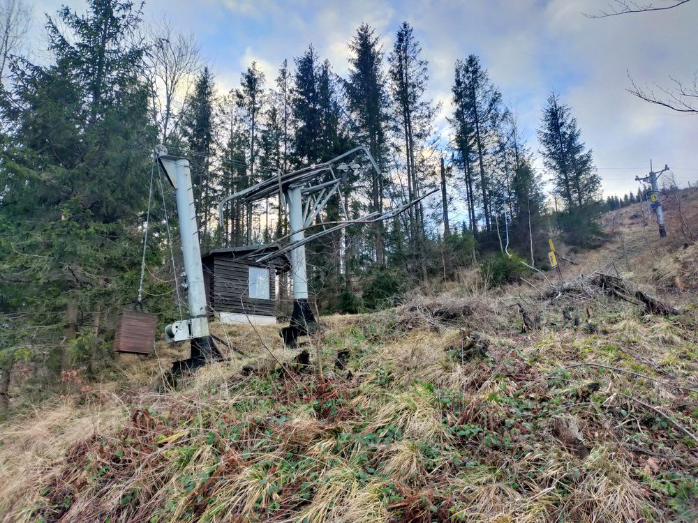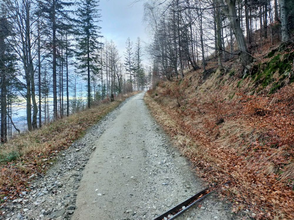 Szlak wiedzie drogą szutrową na sam szczyt. Jest niewymagający i pnie się w górę mniej lub bardziej stromo. Po około 15 minutach odsłania się dość daleki widok w stronę Polski i Słowacji. Doskonale widać kombinat huty w Trzyńcu. Następnie szlak przecina nieużytkowany (?) ratrak i wchodzi w las. Przed wejściem do lasu zauważyłem skrótkę biegnącą stromo z okolic schroniska w dół. Szlak prowadzący w lesie stawał się coraz bardziej zaśnieżony, a właściwie z pozostałościami białego puchu i lodu. Po około 20 minutach dotarłem do łącznika Javorovy (Gutskie Rozc.) 850 m. n p.m., gdzie krzyżuje się szlak niebieski z zielonym. Stąd lekko stromym podejściem za 10 minut dotarłem do przełączki między schroniskiem leżącym na tzw. Małym Jaworym a Jaworowym Wiechem.