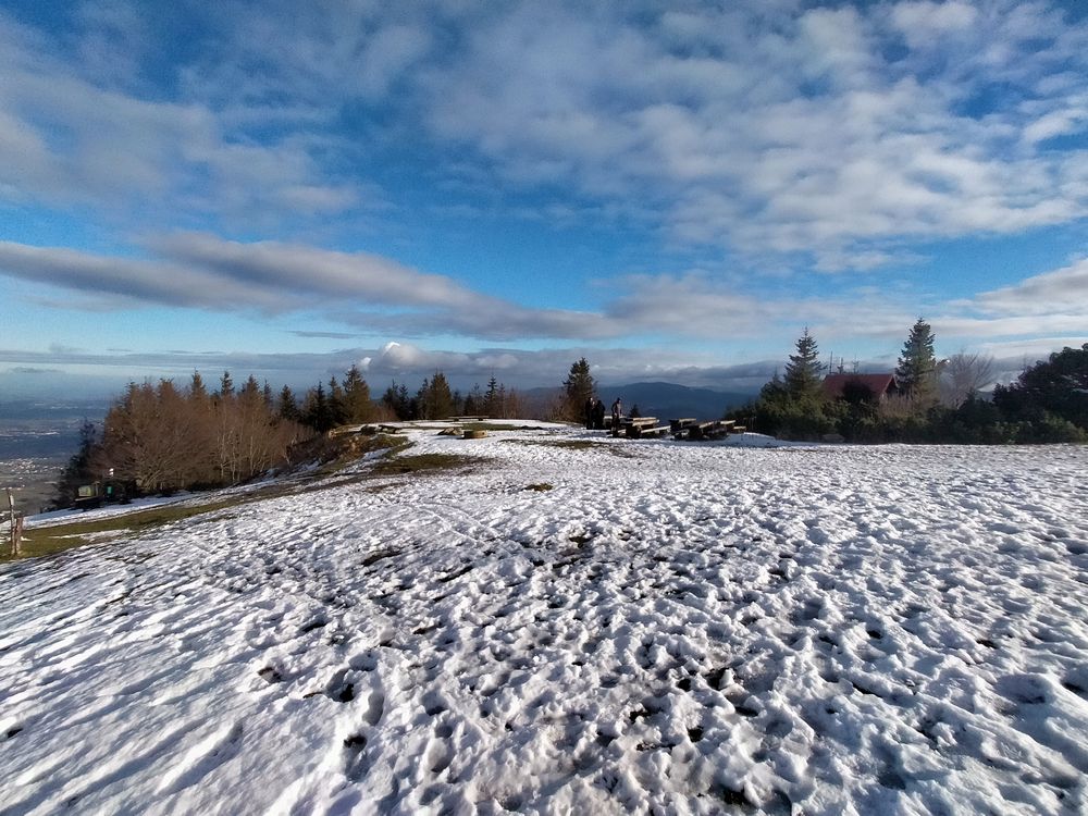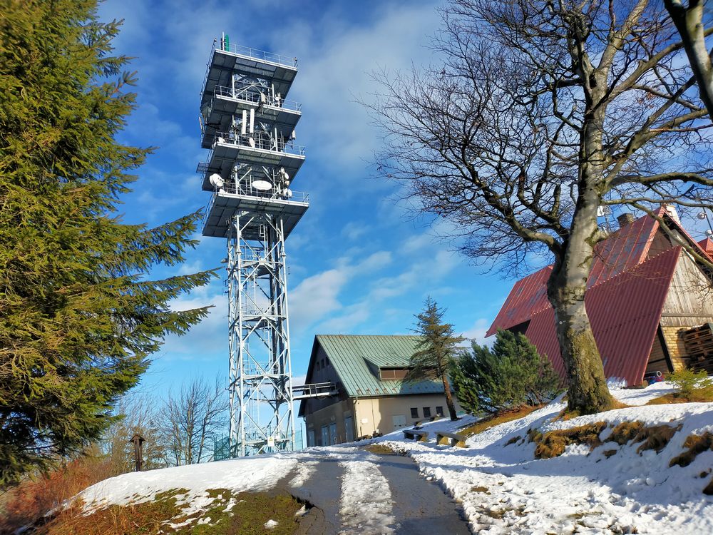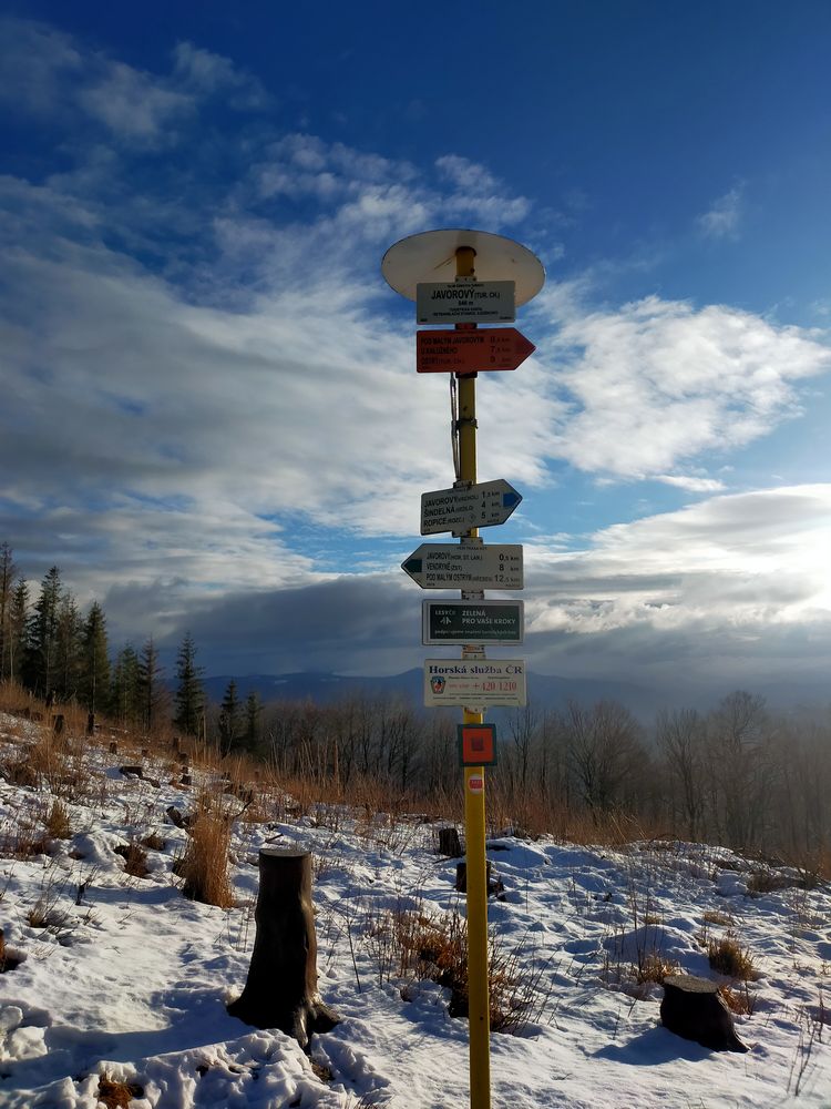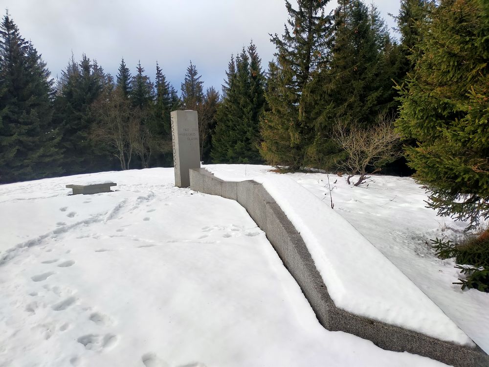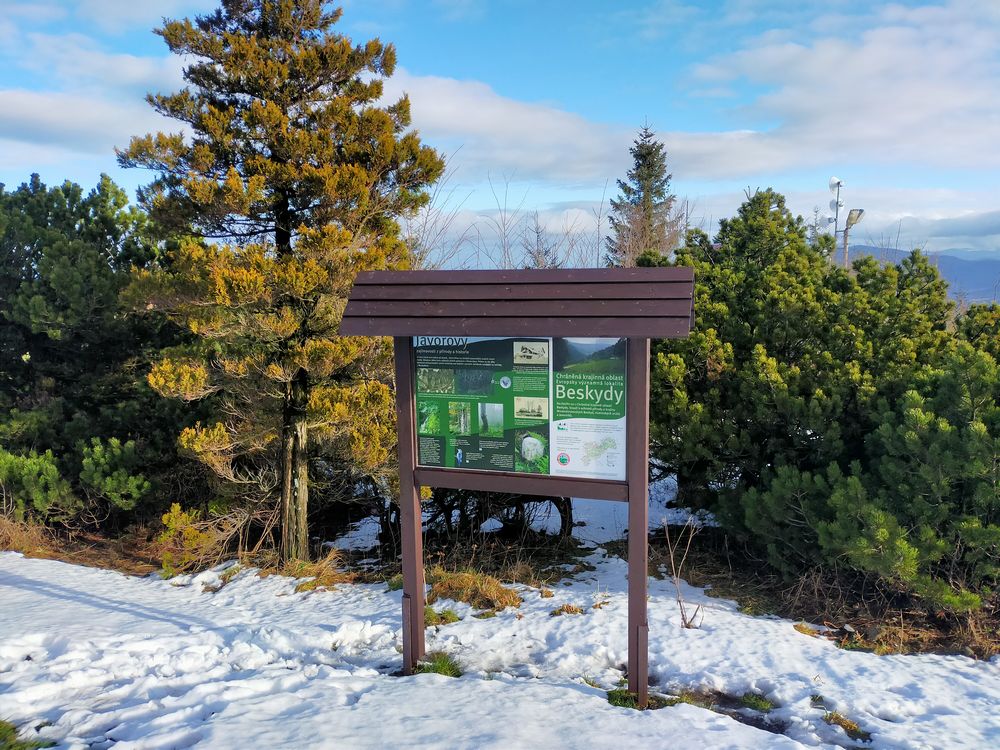 Kontynuowałem zgodnie z planem trasę niebieskim szlakiem na sam szczyt Jaworowego Wierchu. Na trasie było dość sporo zlodowaconego śniegu. Po około pół godzinie dotarłem na szczyt. Na nim znajduje się monument z nazwą góry, wysokością, którą wykonał PTTS Beskid Śląski. Z tego miejsca można iść dalej np. do Ropic czy Rzeki (cz. Řeka). Ciekawą opcją jest także kontynuowanie trasy do łącznika z żółtym szlakiem (Pod Javorowym 977 m n.p.m) i powrót zielonym szlakiem na łącznik Javorovy (Gutskie Rozc.) 850 m n p.m.