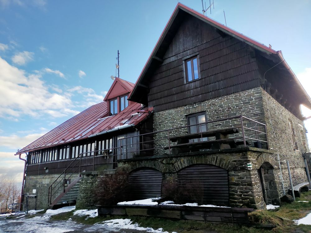Javorový. Spod schroniska rozpościera się bardzo atrakcyjna panorama. W środku mieści się restauracja. Było dość sporo ludzi. Zamówiłem dużą kofole i zjadłem śniadanie. Przybiłem sobie pieczątki oraz udałem się w drogę powrotną do samochodu. Po drodze dało się zauważyć dużo ludzi wchodzących szlakiem niebieskim, sporo z dziećmi i psami. Co ciekawe bardzo dużo w górach jest tutaj kobiet (porównując z innymi miejscami). W aucie byłem po 45 minutach. Trochę wstyd mi było, że stałem na szlaku nieco wyżej od parkingu, ale cóż 😉