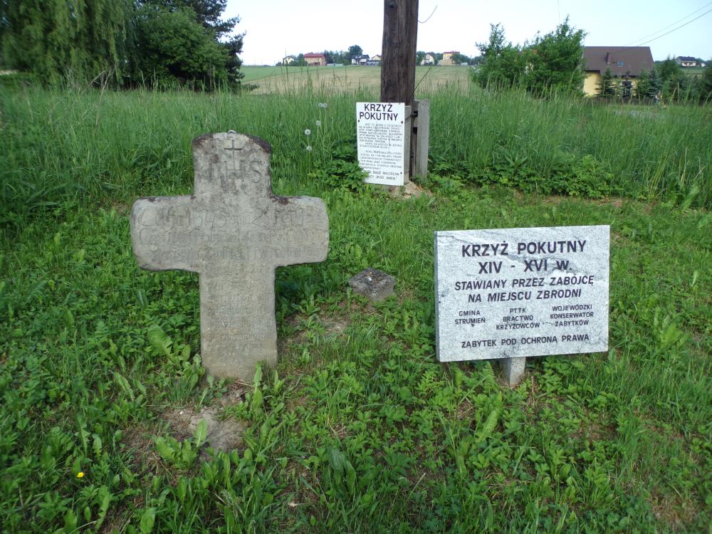 Jadąc do Cieszyna przy głównej drodze w miejscowości Pruchna na ulicy Katowickiej stoi kamienny XVII wieczny krzyż pokutny wykonany z piaskowca. Jest to nieliczny i najstarszy tego typu zabytek na Śląsku Cieszyńskim. Krzyż znajdował się wcześniej w rowie przy drodze Cieszyn – Katowice. W 2009 roku został on odrestaurowany przez pracownię konserwatorską Andrzeja Zdyra z Zawoi na zlecenie Urzędu Miejskiego w Strumieniu i postawiono na skrzyżowaniu ulic Klisztwa i Cieszyńskiej. Co ciekawe pierwotne miejsce, gdzie stał krzyż znajdowało się po drugiej stronie tejże drogi, jednak mieszkaniec Pruchnej, pan Paweł Błahut przeniósł go w pobliże swojej posesji, gdyż uległby on zniszczeniu z powodu budowy drogi Pawłowice – Cieszyn.